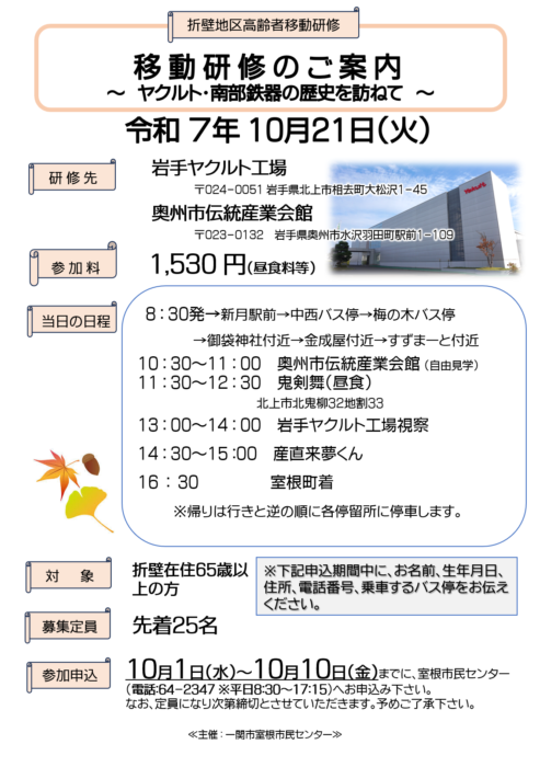 令和7年10月21日火曜日に折壁地区65歳以上を対象とした移動研修を開催します。