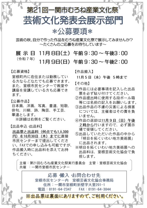 第21回一関市むろね産業文化祭芸術文化発表会展示部門出品公募開始