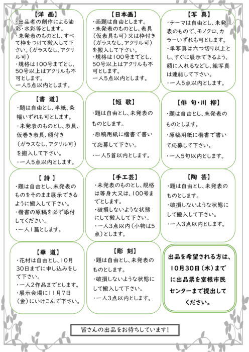 ※作品は11月5日水曜日午後5時00分までに室根市民センターへ搬入ください。