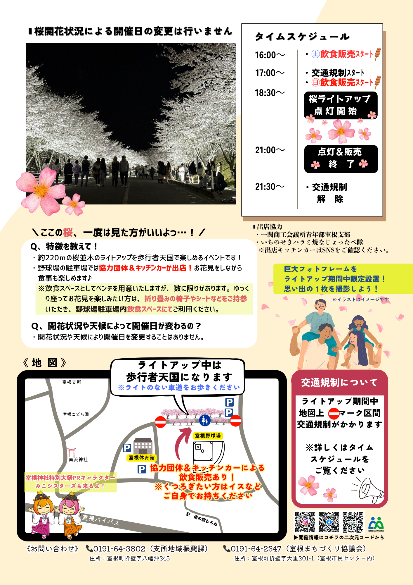 また、ライトアップ中は歩行者天国となりますので、室根野球場付近桜並木220m区間において17時00分から21時30分まで交通規制がかかります。