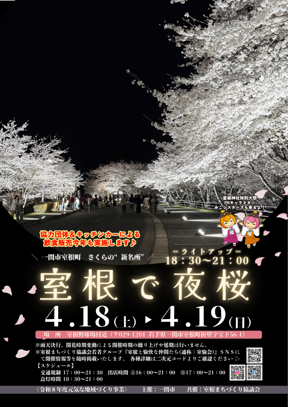 令和8年4月18日土曜日から19日日曜日の2日間、室根野球場付近桜並木のライトアップイベントが実施されます!