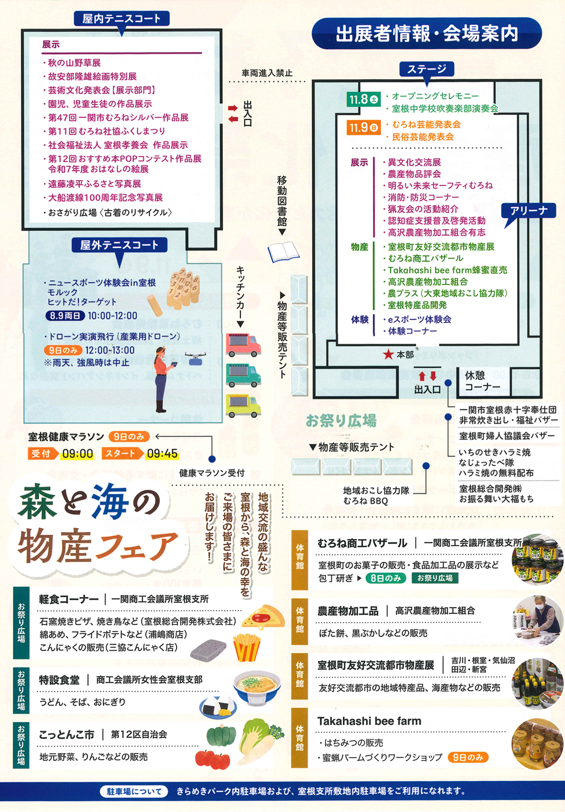 ・むろね芸能発表会 、民族芸能発表会 ※日曜日のみ ・室根町友好交流都市物産展(根室市、田辺市、新宮市、吉川市、気仙沼市) ・eスポーツ体験会 ・猟友会活動紹介 ・農産物品評会※土曜日のみ ・異文化交流展 ※日曜日のみ 他