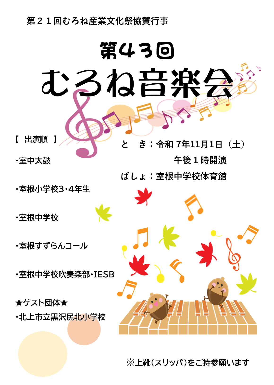 11月1日土曜日に室根中学校体育館を会場に「第43回むろね音楽会」を開催します!