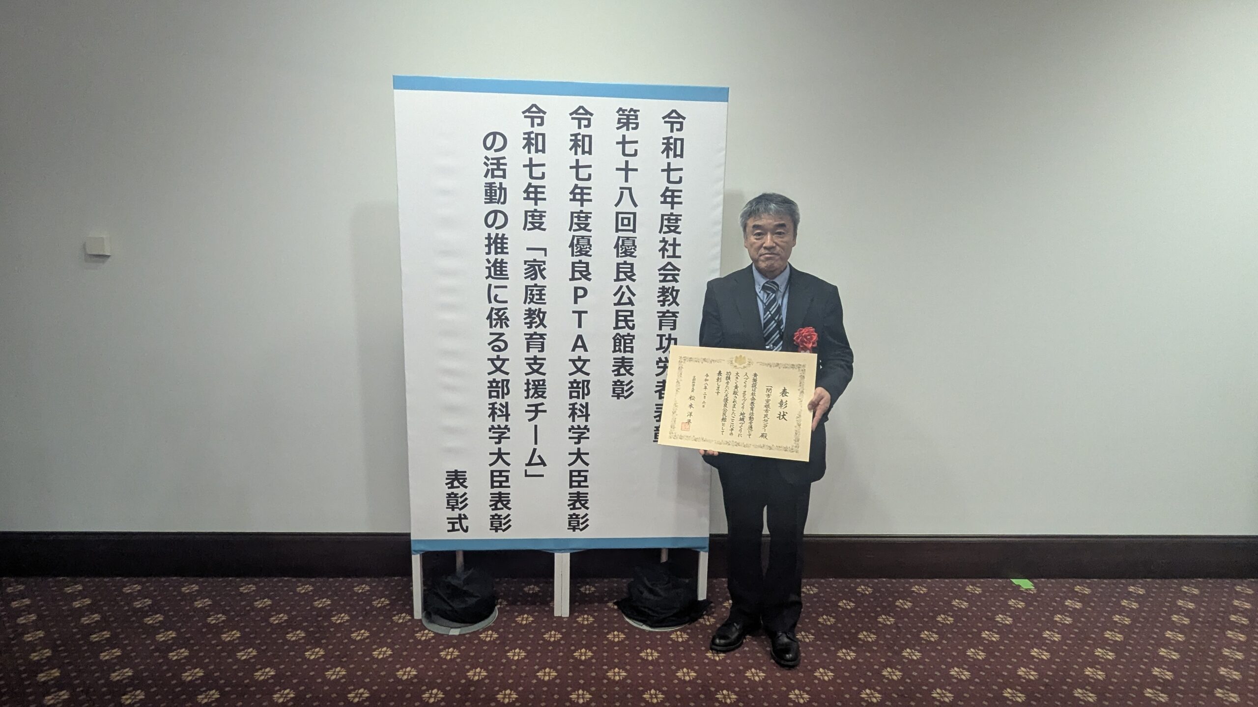 室根市民センターは第78回全国優良公民館文部科学大臣表彰を受賞し、令和8年2月6日金曜日に文部科学省東館3階第一講堂(東京都千代田区霞が関)にて開催された表彰式に、当センターの金森勝利所長が出席し、表彰状を授与いただきました。